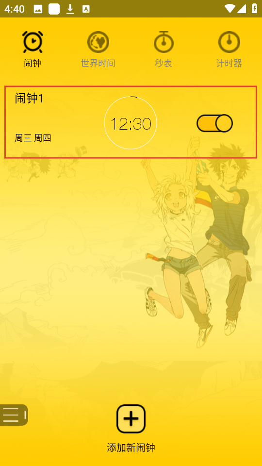 修改完成后回到闹钟主页面,就能看到【闹钟1】的时间已经变成【12:30】,重复日期显示为周三和周四,这说明设置已经成功完成了。