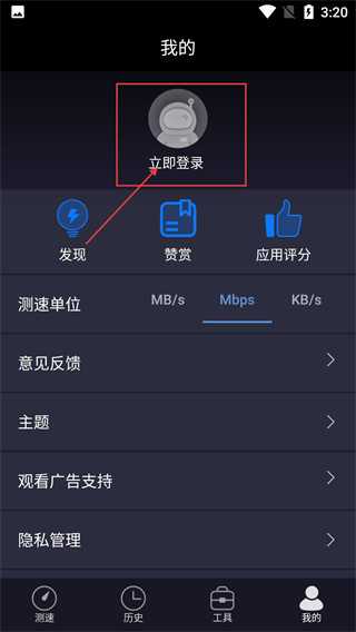 2、进入个人中心页面后,点击顶部的【立即登录】区域,就能启动用户登录流程,此外,该页面也支持测速单位等设置操作。