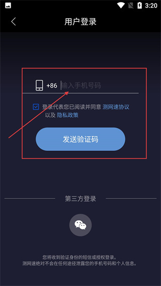 3、进入用户登录页面后,输入手机号码,点击“发送验证码”按钮,就能获取验证短信了。