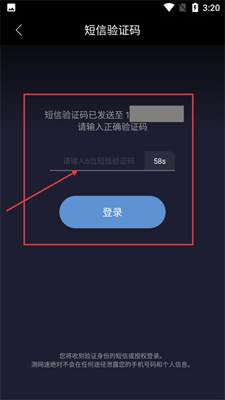 4、进入短信验证码页面后,输入你收到的6位验证码,接着点击【登录】按钮,这样就能完成账号验证,顺利登录应用了。