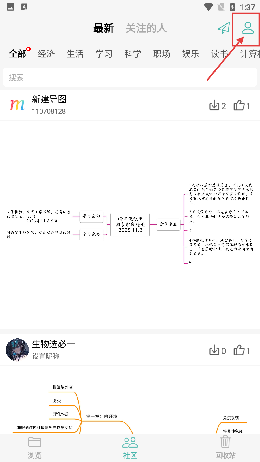 3、进入社区界面后,点击右上角的人物图标,就能查看个人相关信息;在社区内可以浏览最新的思维导图作品,这些作品涵盖经济、生活、学习等多个分类。
