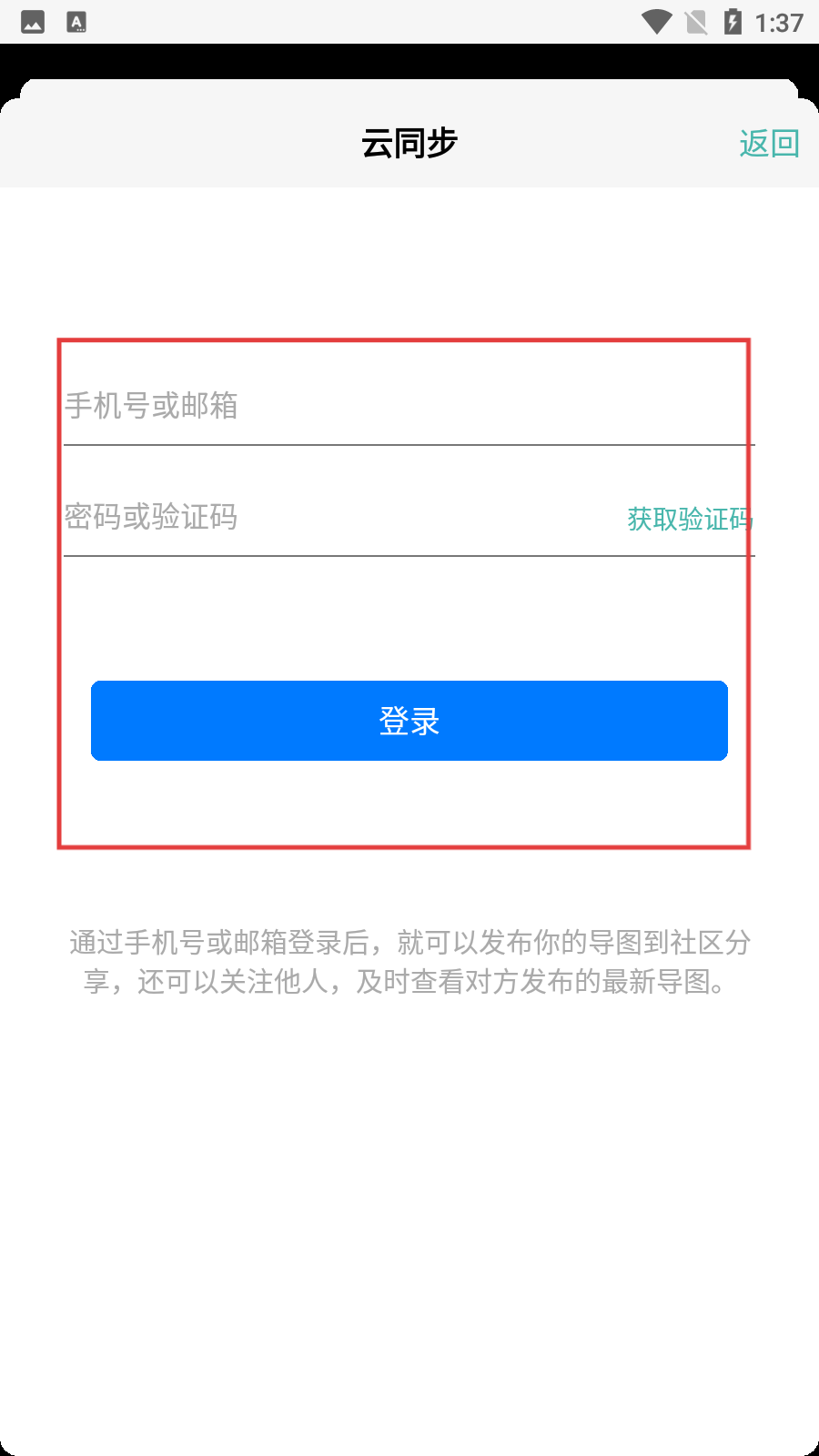 4、在云同步登录界面,支持使用手机号或邮箱完成登录操作;登录成功后,不仅能够实现思维导图的云同步功能,还可以将自己制作的导图发布到社区与他人分享,同时也能关注其他用户的导图动态。