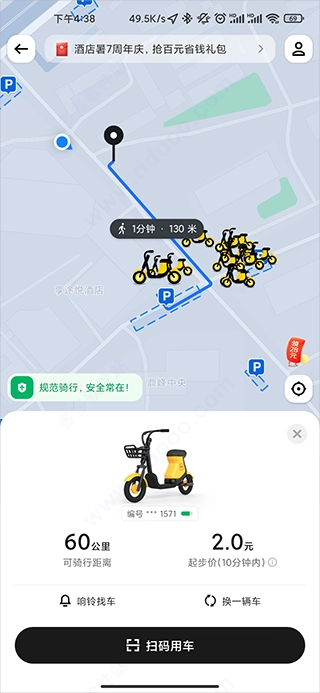 3、点击地图上的单车,还能对其进行导航、查看电量,也可以通过响亮找车功能定位车辆,找到后点击扫码,使用美团扫码即可骑行。