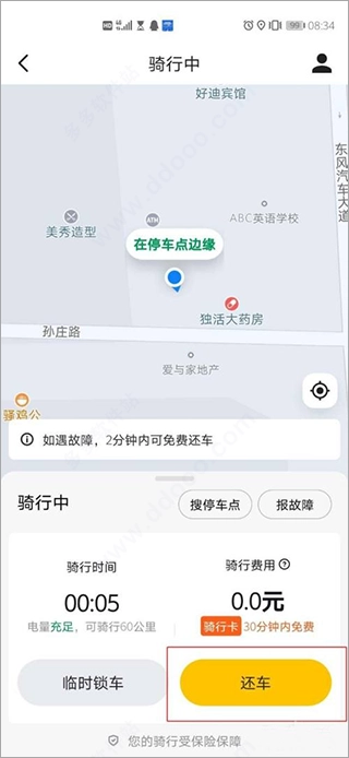 单车的收费方式为按半小时X元计费,用户可清晰查看骑行的时间和里程。