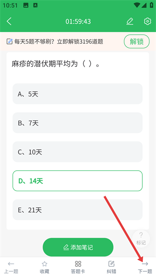 4、选好当前题的选项后,点击页面底部的【下一题】按钮,接着完成每日一练剩下的题目。
