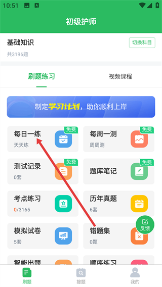 1、在【初级护师】刷题页面,找到【每日一练】功能选项并点击,进入每日一练的学习日历界面进行练习。