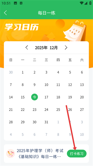 2、在【每日一练】的学习日历页面,点击【打卡练习】按钮,即可进入对应科目的每日一练答题环节。