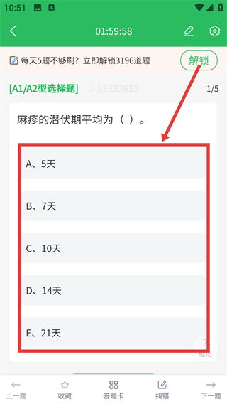 3、进入每日一练答题页面后,找到【A1/A2型选择题】,对这类题目的选项进行选择,以此完成该题的作答。