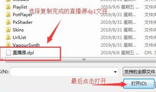 在PotPlayer的文件目录里找到“直播源.dpl”文件,选中后点击打开,具体操作可参照图示。