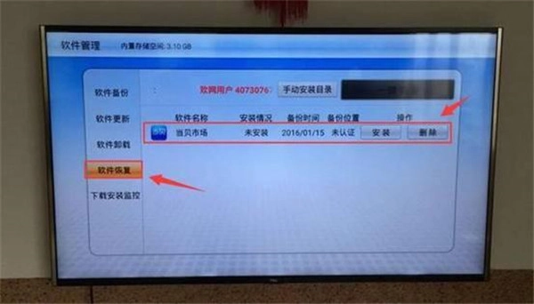4、把U盘插到电视上,打开应用中的电视卫士,进入软件管理板块并选择软件恢复功能,找到当贝市场APK文件后点击安装,这样就完成操作了。