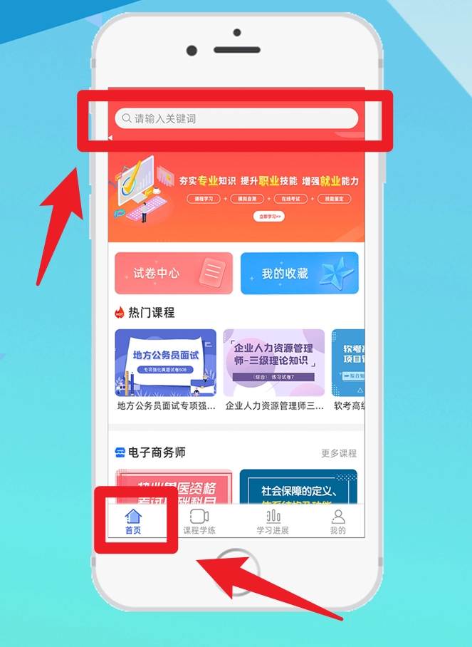 2、登录成功后可选择至首页界面,通过顶部搜索栏输入关键词,快速查找相关课程内容。