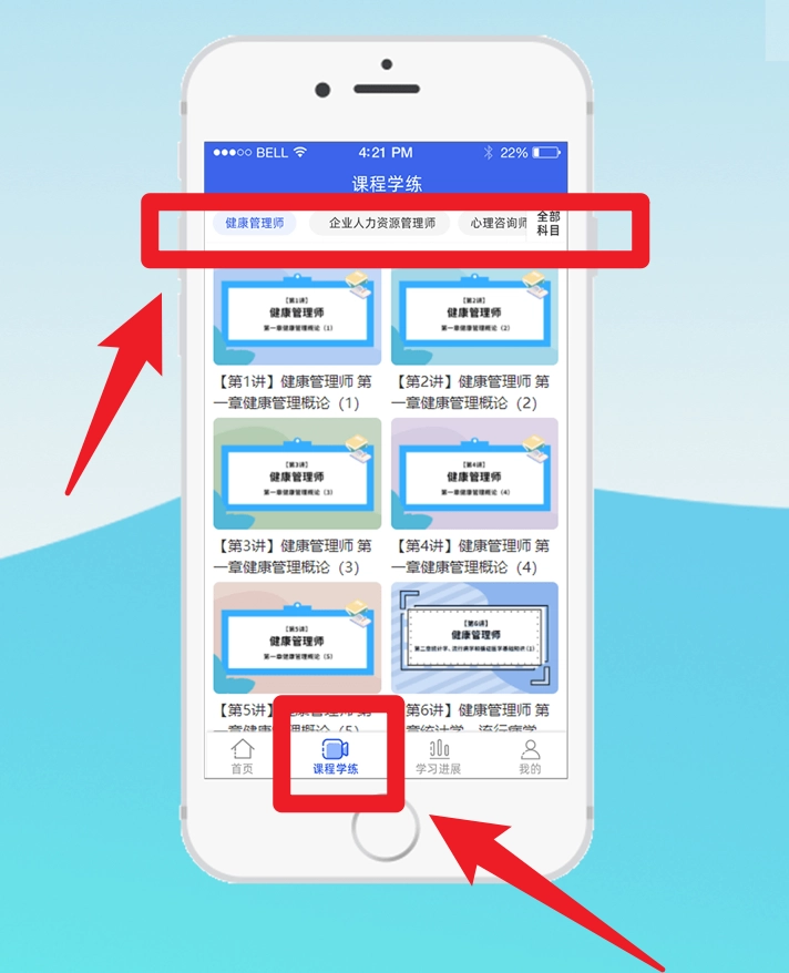 3、点击下方栏中的课程学练,可按类别如健康管理师、企业人力资源管理师等,浏览可选课程资源。