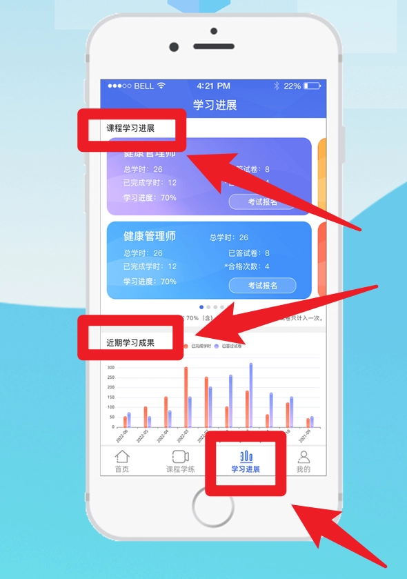 4、点击进入学习进展页面,能够查看已学习课程的数量、完成率,以及近期学习成绩的柱状图分析。