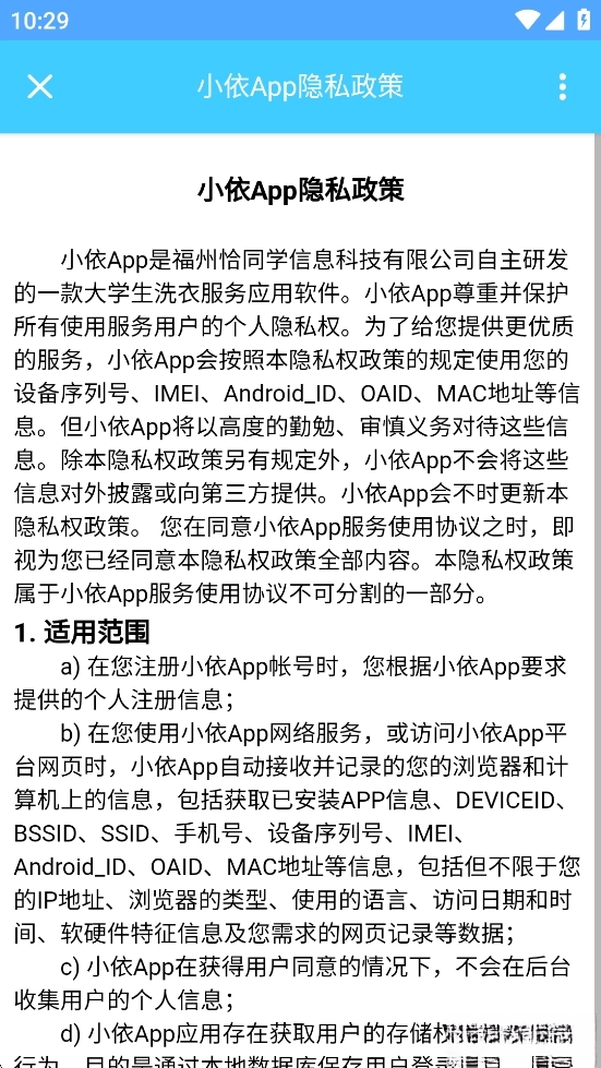 《小依》是福州恰同学信息科技有限公司专为学生打造的一款校园共享洗衣机软件,广大的学子们可以通过本款软件来连接共享洗衣机,可以选择洗衣模式,让学子们可以自由的去使用洗衣机,更好的来清洗衣服,节省时间,便利学校的生活。