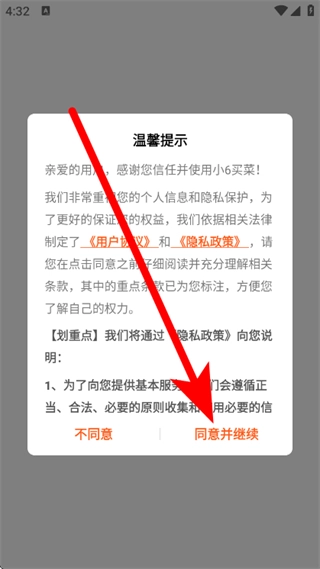 1、打开小6买菜应用,待出现温馨提示弹窗后,点击“同意并继续”按钮。