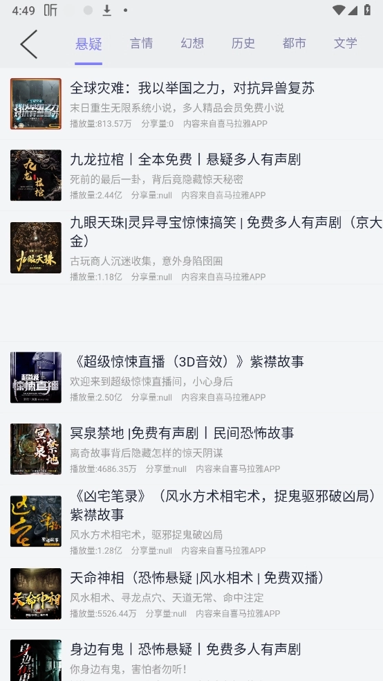 1、有声小说板块:汇聚了《鬼吹灯》全集、《盗墓笔记》、《茅山后裔》、《王妃》、《凶宅笔记》等热门作品,资源储备丰富,且每日持续更新。