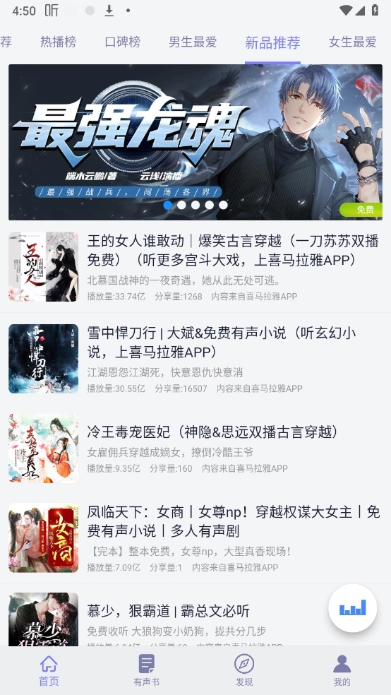 1、在本站安装听书精灵应用,启动并进入软件后,首页会展示各类热门推荐的有声书资源