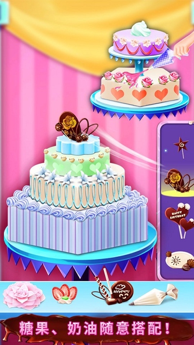 为蛋糕抹上不同口味的奶油,用巧克力和糖果来装饰蛋糕;