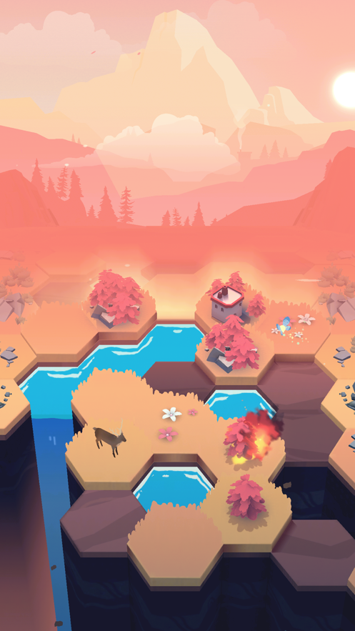 1、玩家在游戏中需要在六边格地图里造湖植树,一格湖泊会将周围一圈空格变成陆地,在陆地上可以种树,若干树连起来可以合成树林,树林再合成小屋,小屋合成村庄,依次类推。每次行动都会带来时间的流逝,游戏画面也会根据当前的季节发生变化,玩起来非常养眼。