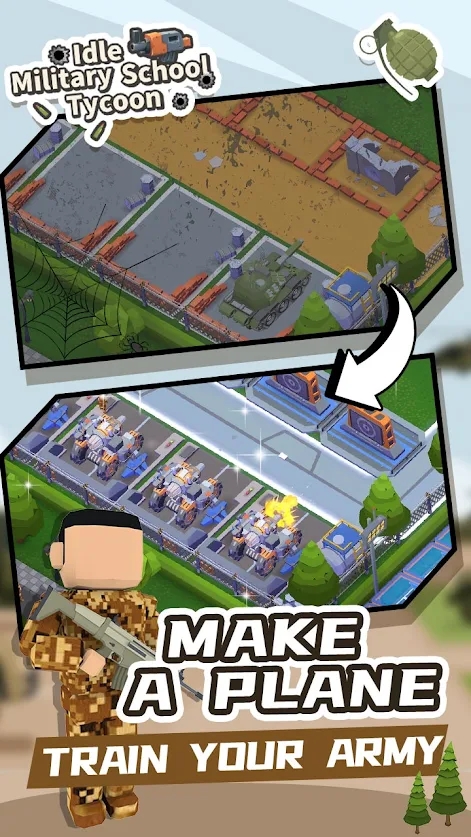 空闲的军校大亨是一款非常有趣的策略经营类游戏,在游戏中建立自身的世界闻名,用自身的创造力来打造出,建立大量工程建筑、武器装备、专用工具等,游戏中的每一步发展趋势都越来越强大的实际操作,让自己的军队能更加的强大下去。