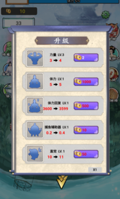 2、游戏中的主人公为姜老头,玩家需要帮助姜老头钓鱼,从而升级体力耐力各项属性。