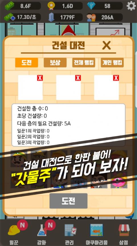建造大楼模拟器是一款休闲好玩的模拟城市经营游戏,在游戏中,玩家需要从头开始完成对大楼的建设工作,游戏玩法简单有趣,操作起来也很方便。玩家可以雇佣更多的人来分担经营的压力,完成建筑后就可以招商,吸引更多的人前来,喜欢的小伙伴们可以下载试试看!