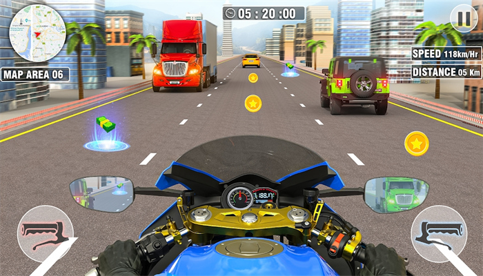 1、通过倾斜手机或操作按钮来控制摩托车的加速、转向和刹车;