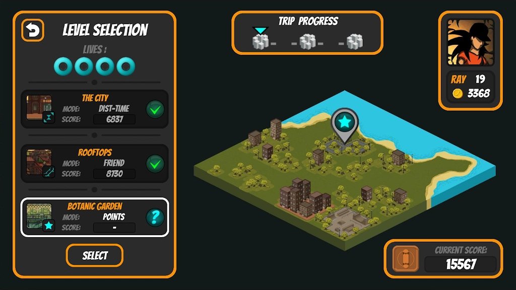 2.通过比赛赢得金币,购买更高级的滑板和装备,提升自身实力;