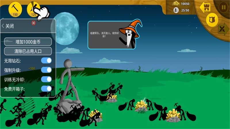 前期点堡垒射手的伤害值,其次点雕像血量,然后控制一个旷工变挖矿边走位,有钱就造兵(后期有弓箭手满300就造弓箭手)前期关卡的兵完全可以靠防守消灭掉,之后升级雕像的皇冠(也就是每过一段时间雕像可以自动生产金币)