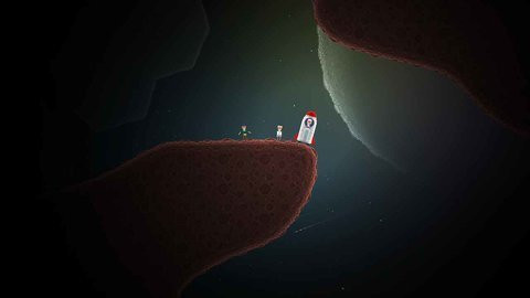 1、游戏在昏暗的画面中控制飞船闯关,根据小人的位置快速的前进向前移动