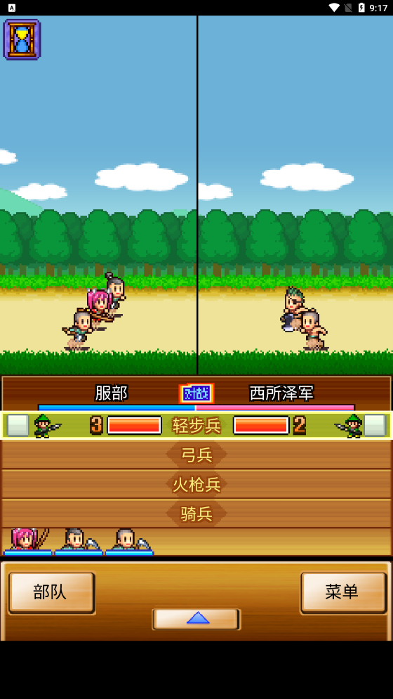 游戏中一共有4种兵种,分别是步兵、弓箭手、铁枪兵、骑兵。玩家可以根据战局的需要购买士兵的类型和数量。这些士兵不需要升级,只是偶尔会和幕府军队一起训练。
