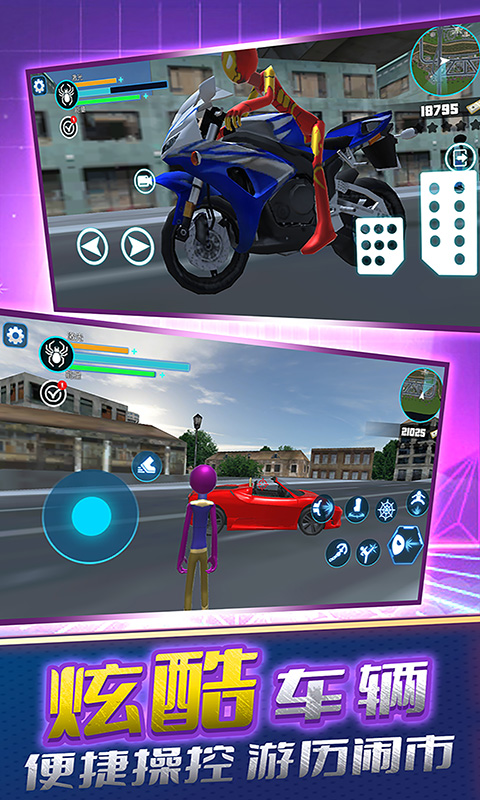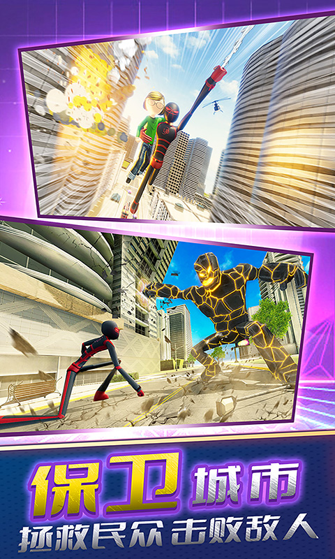 2、城市蜘蛛绳索英雄游戏强大的高科技盔甲,他可以在大城市自由通勤。