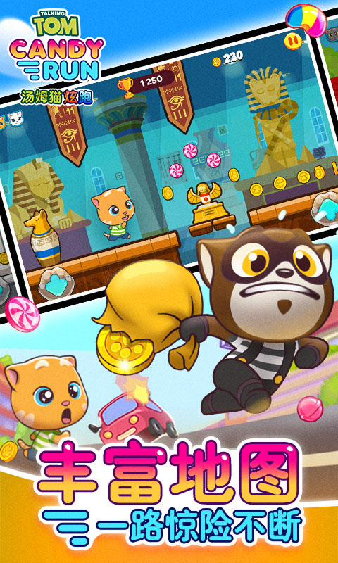 游戏的核心玩法是跑酷闯关。玩家需要控制汤姆猫在各种不同的场景中奔跑,躲避障碍物,收集糖果以获取高分。游戏设有多种地图,如冰川、城市街景、森林等,每个地图都有其独特的挑战和难度。