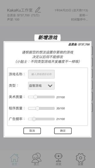 广告模拟器是一款玩法自由且画质流畅的全新休闲益智类游戏。从角色设定到操作玩法,其带来的体验都极为新颖。游戏仅有文字剧情故事,然而广告的植入会对玩家体验产生影响。在游戏里,玩家能领略丰富多彩的游戏场景。感兴趣的小伙伴不妨快来试一试!在这款游戏中,玩家将扮演一名独立游戏开发者,致力于让大家下载到手机上,玩到最好玩的手机游戏。