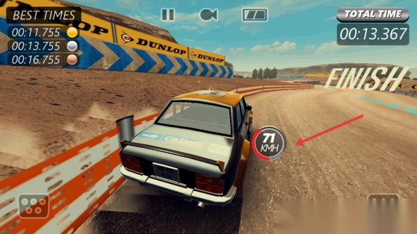 3、在赛道驾驶过程中,需控制车速(留意车速为71KM/H)以及方向,全力冲过“FINISH”标识,以此来刷取时间成绩,争取获得金/银/铜牌。