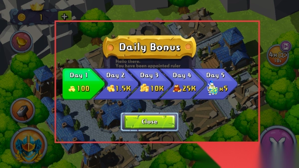 1、先登录领取【Daily Bonus】,首日可得100金币,连续签到奖励愈发丰厚,助您积累资源,推动王国发展。