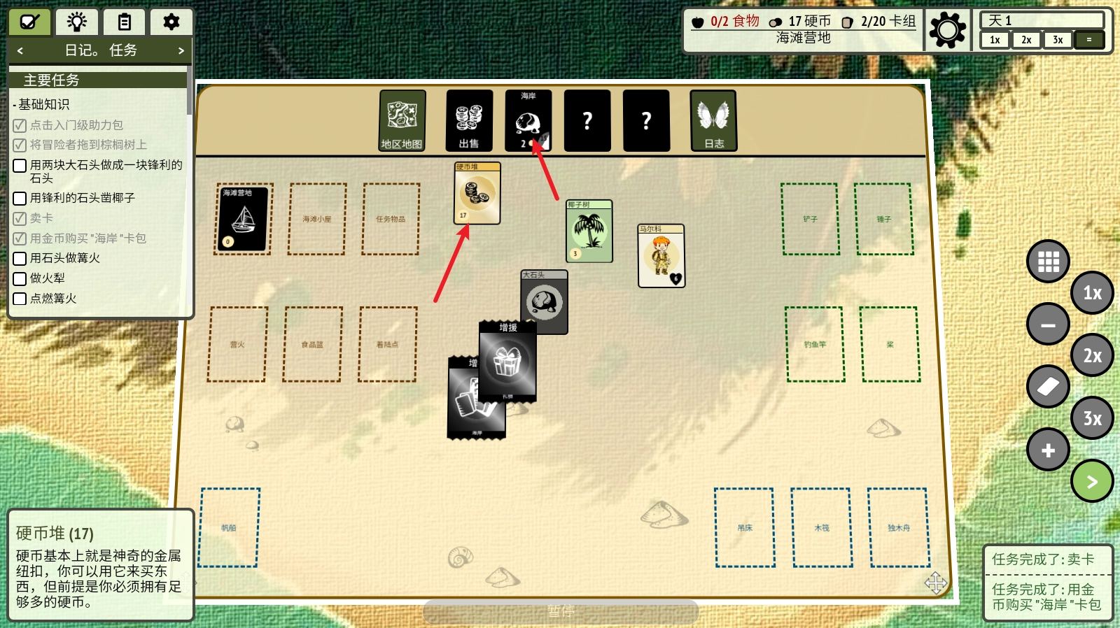 6、将硬币堆拖动到海岸这里还可以去购买新的卡牌。