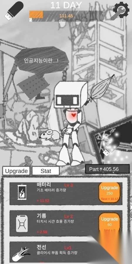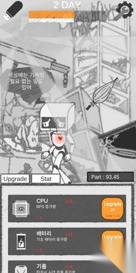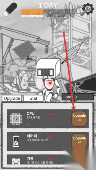1、在首日界面,点击CPU、电池等部件的【升级】,消耗资源(例如20、40 ),提升机器人属性(BPS,电池 - 使用量)。
