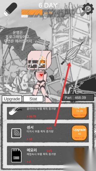 3、到第6天,查看机器人外观、部件等级变化,点击使用道具(雨伞),或继续强化核心部件,推进游戏进度。