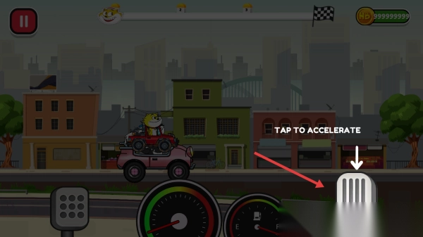 2、点右侧加速键(TAP TO ACCELERATE),控粉色赛车,冲起步,超对手(黑白色角色)。