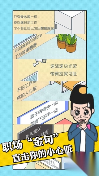 1、核心目标从高效工作转变为合理划水,每日任务包含带薪如厕、咖啡续命、窗口围观等非KPI事项。道具栏常备三件摸鱼神器:永远充不满电的充电宝、自动回复的请假条、能屏蔽老板视线的盆栽。2、办公桌的抽屉里暗藏着跨维度通道,只要连续点击三次订书机,就能召唤出异次元快递箱。而文件柜的第三层设有空间折叠区域,当放入三支红色记号笔后,便会生成一条临时逃生通道,利用它能持续躲避领导巡查15秒。