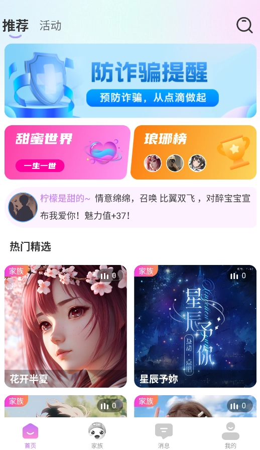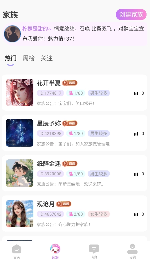 2、进入"家族社区"可创建专属家族群,或通过申请加入其他兴趣家族参与互动。