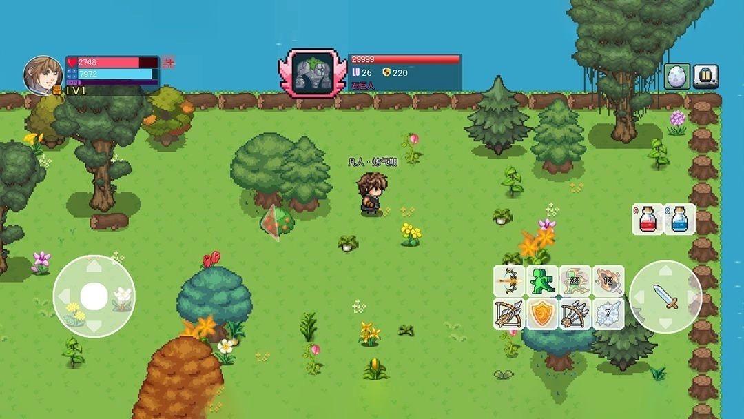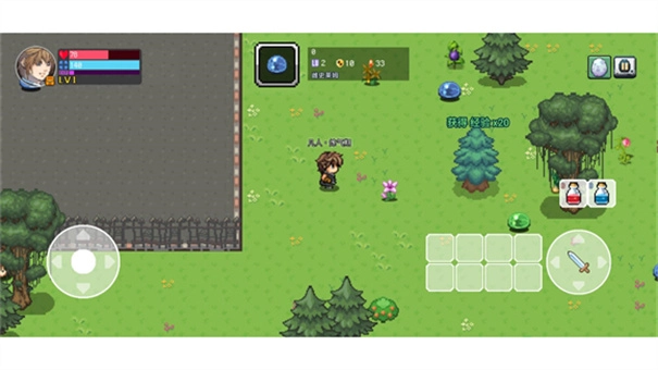 3、游戏界面的左边控制角色的移动,右边是物品栏、攻击键和回复药。