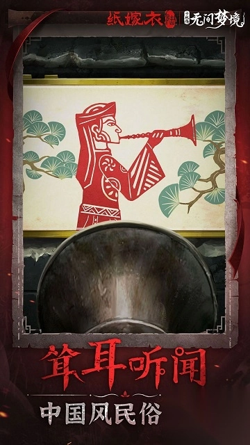 2、唢呐与祭服:丧仪堂用石刀开石棺,获取「唢呐」;手机嵌石碑凹槽,吹奏唢呐(亮字长按),获「纸衣服」;烧纸衣服和福字旗给老头。