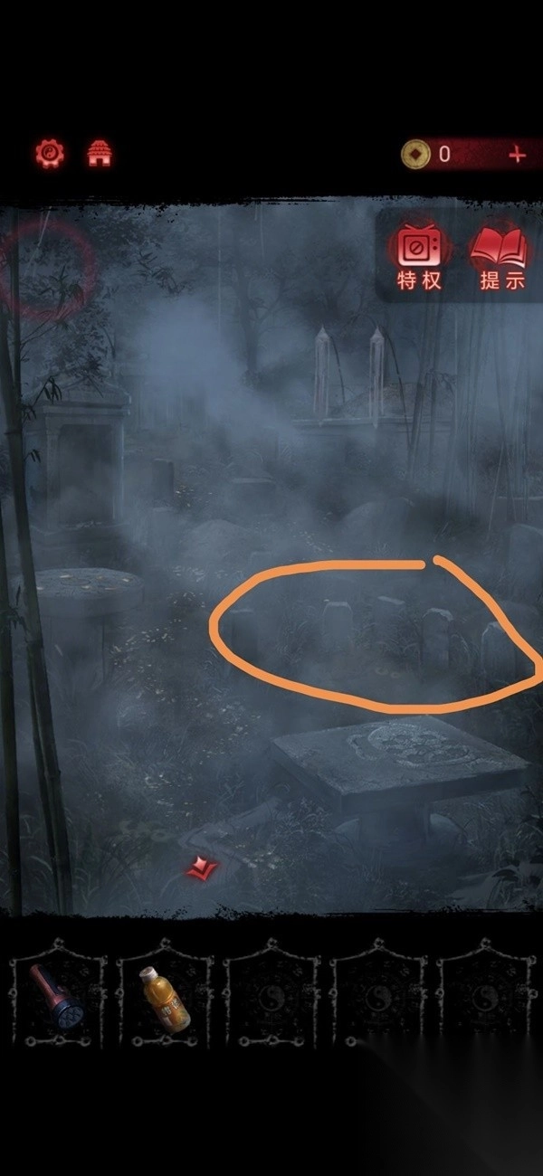 1. 村口起始互动:点击左下角的书包,拾取「手电」以及「饮料」;和老头进行对话,触发“供奉衣物”任务,进而解锁坟场场景(从右侧箭头处进入)。