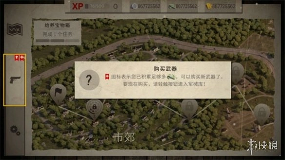 1、当您登录游戏,若看到"+图标"提示,说明已累积足够货币可购置新装备。立即前往军械库请点击确认按钮。
